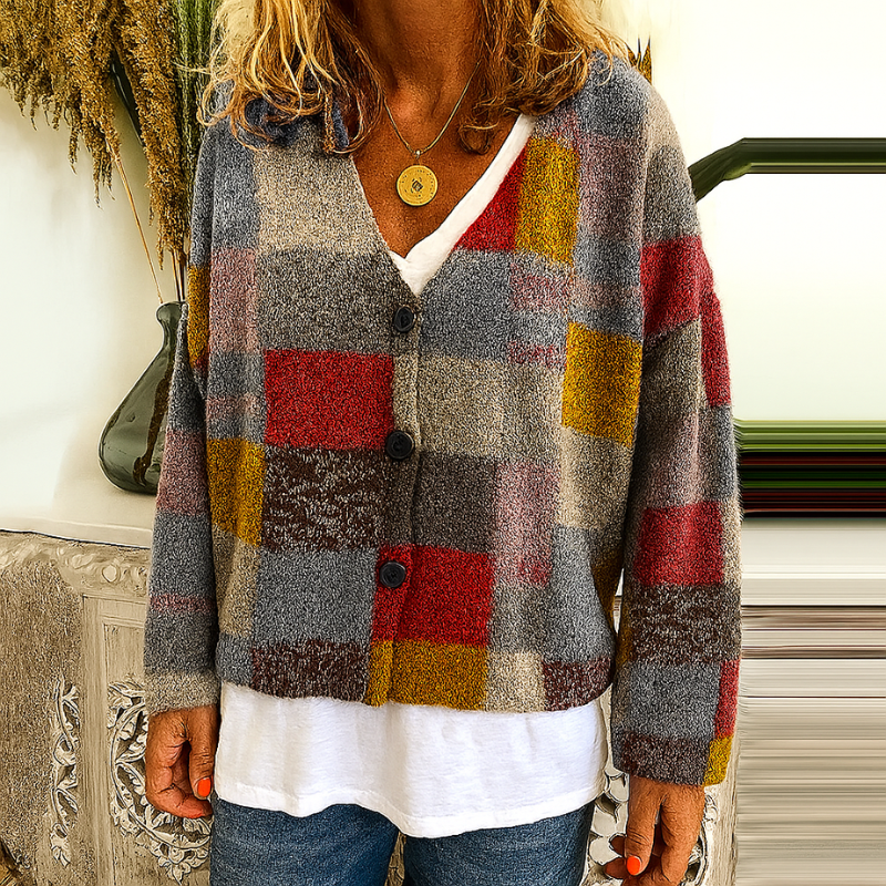 Este cárdigan de mujer se caracteriza por un ajuste amplio con escote en V y mangas largas de corte relajado. El estampado patchwork multicolor aporta un look vibrante. El tejido ligero y suave lo hace ideal para la media estación.