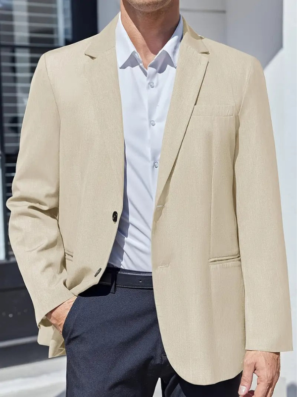 Este blazer de hombre presenta líneas esenciales con hombros ligeramente estructurados y un diseño de un solo botón que aporta una elegancia discreta. El corte moderno sigue la silueta sin resultar excesivamente ajustado, mientras que el tono claro lo hace adecuado para contextos formales y semi-formales. Perfecto para la temporada de primavera y verano, mantiene un estilo sobrio y refinado.