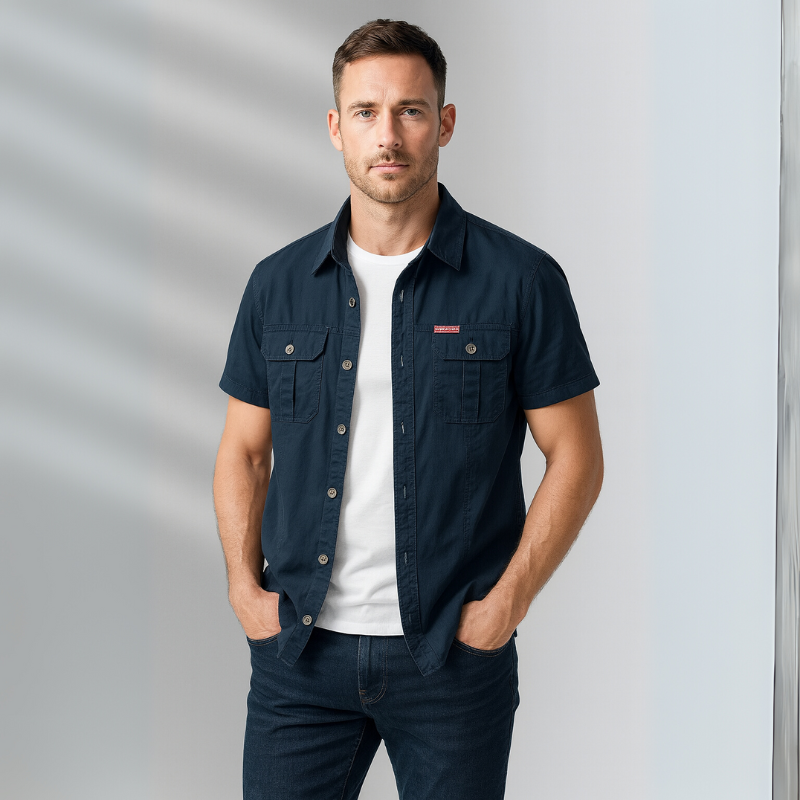 Camisa de hombre de algodón con corte casual, mangas cortas y silueta sencilla. El doble bolsillo frontal con solapa añade un detalle práctico y decorativo, mientras que el tejido la hace adecuada para la temporada cálida.
