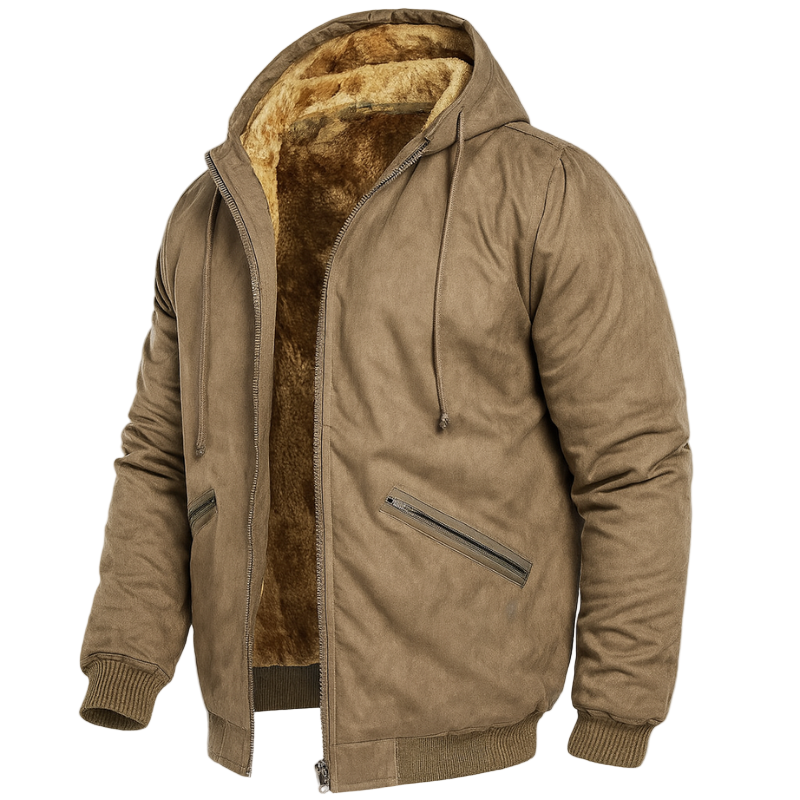 Chaqueta de hombre con capucha y forro de sherpa, caracterizada por un diseño lineal y robusto. El cierre con cremallera y los bolsillos laterales completan esta prenda versátil, perfecta para la temporada fría.