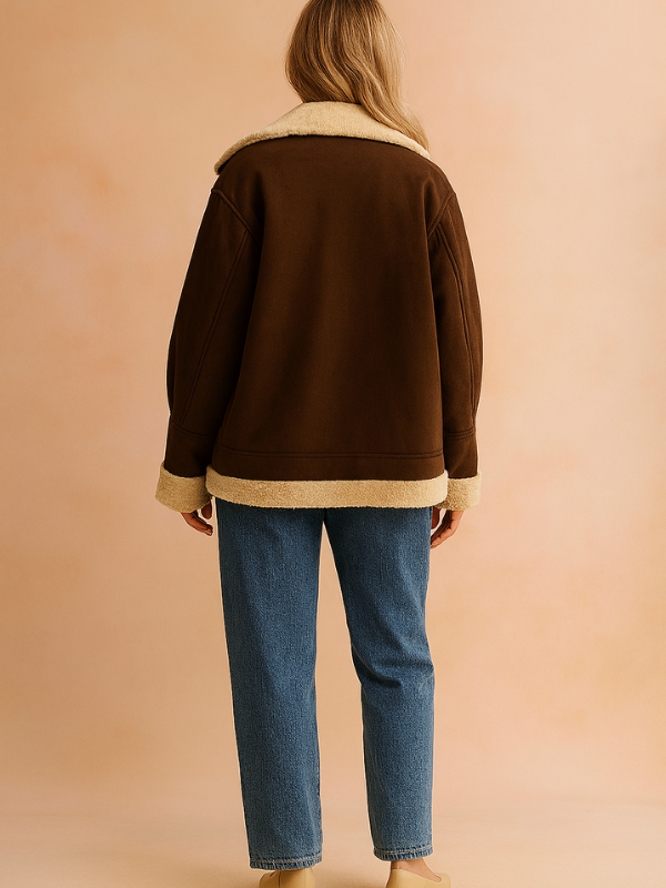 Chaqueta de mujer estilo aviador con amplio cuello de shearling sintético en contraste y forro a juego. El corte recto con mangas largas y puños añade estructura al diseño, mientras que los detalles visibles le dan un carácter audaz. Ideal para las estaciones de otoño e invierno, combina la estética urbana con líneas clásicas.