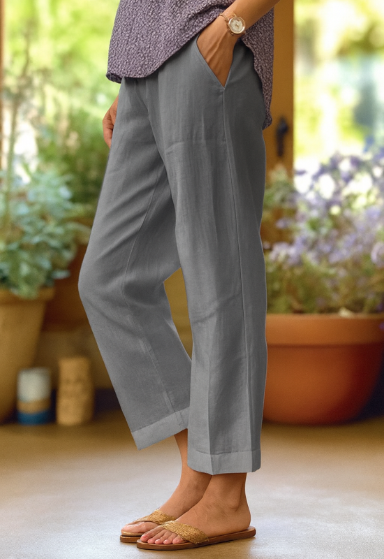 Estos pantalones de mujer presentan un corte amplio y recto con un diseño sencillo. Fabricados en lino natural, ofrecen un ajuste fluido y un look refinado. Disponibles en una gama de tonos sobrios y elegantes, son especialmente adecuados para la temporada de verano.
