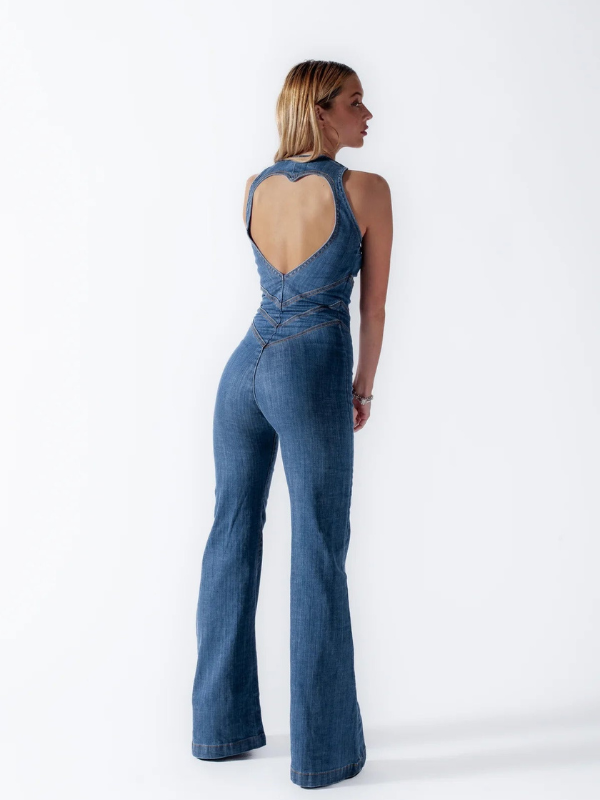 Peto de denim de línea ajustada, con pierna acampanada y escote profundo en el frente. En la parte trasera presenta un detalle en forma de corazón que deja parcialmente descubierta la espalda, aportando un toque distintivo.