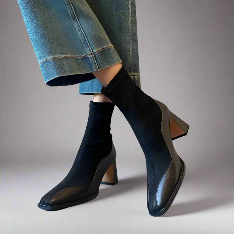 Estos elegantes botines combinan una parte superior de ante con detalles tono sobre tono. La punta cuadrada y el tacón geométrico crean una silueta audaz pero equilibrada, perfecta para las estaciones intermedias.
