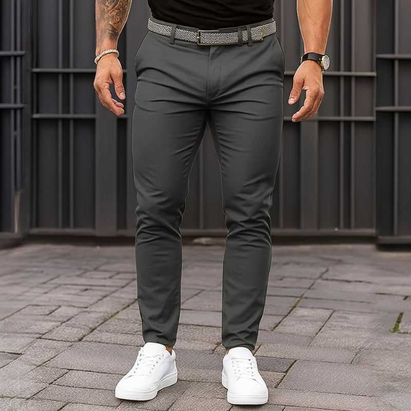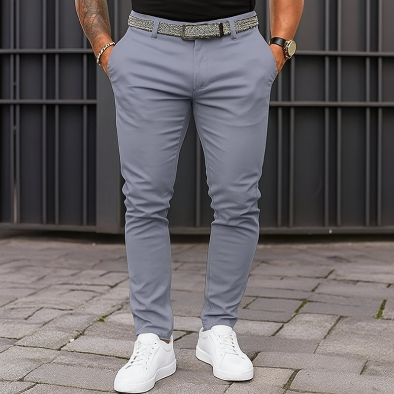 Ce pantalon d'été pour homme présente une ligne slim essentielle et moderne, avec une longueur à la cheville qui valorise la silhouette. Confectionné dans un tissu léger et respirant, il est disponible dans des tons neutres et raffinés comme le gris anthracite, le gris clair et le blanc. La fermeture frontale épurée et la structure minimaliste le rendent adapté aux contextes décontractés et semi-formels durant la saison chaude.