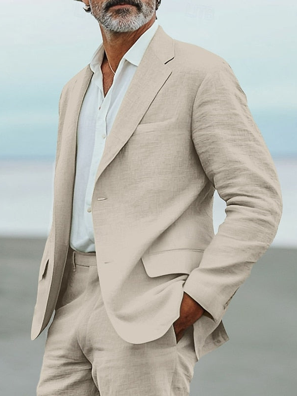 Costume homme en lin deux pièces composé d'un blazer et d'un pantalon droit assorti. Le tissu naturel offre un look frais et décontracté, tandis que les lignes épurées maintiennent une élégance sobre.