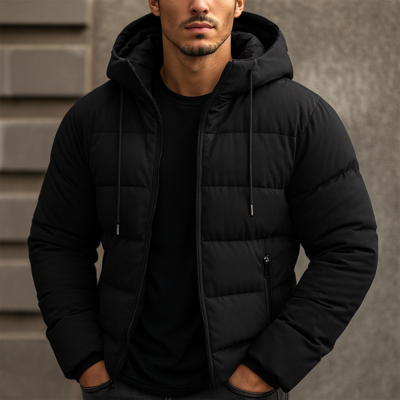 Cappotto invernale da uomo con cappuccio trapuntato: giacca calda, fodera strutturata e design elegante per un abbigliamento casual