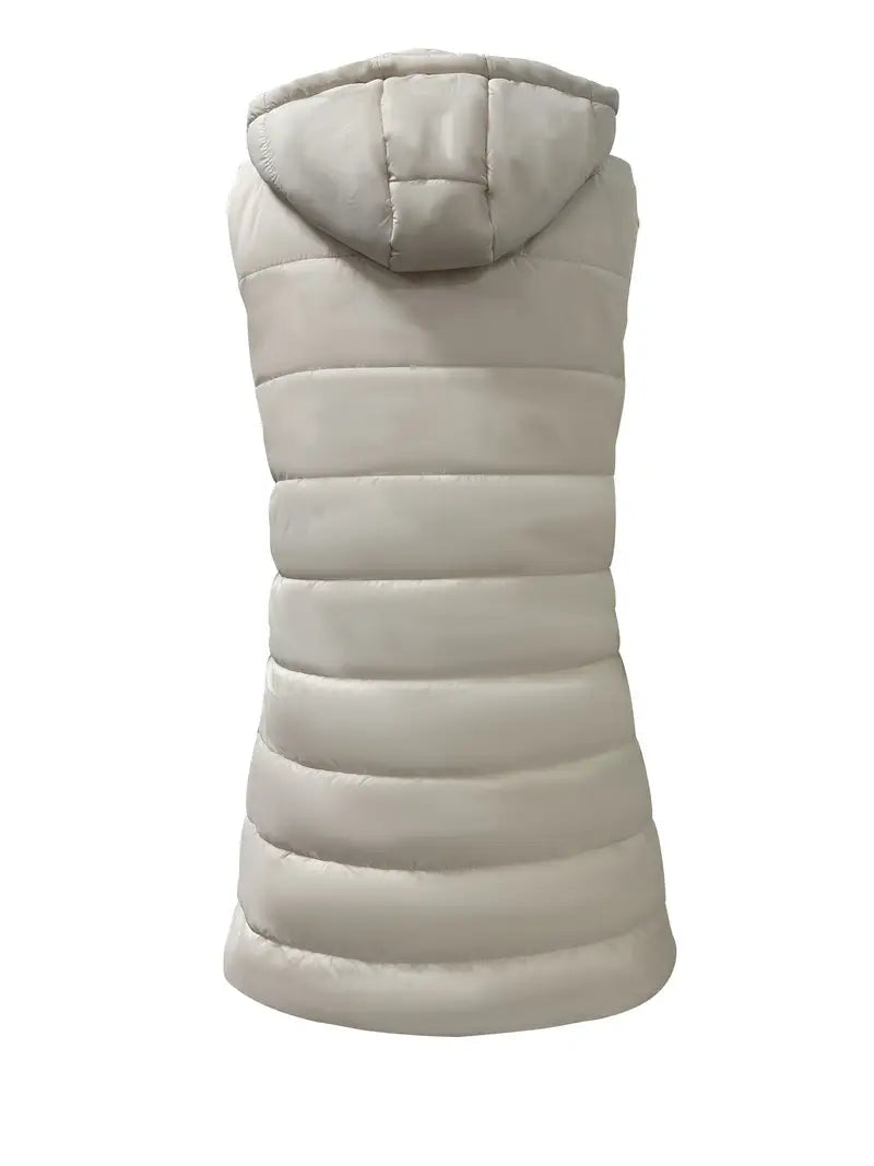Gilet lungo imbottito dal taglio lineare, caratterizzato da trapuntatura orizzontale e cappuccio integrato. Realizzato in tessuto tecnico, presenta chiusura frontale con zip e tasche laterali. Il colore beige chiaro gli conferisce un look semplice e contemporaneo, perfetto per la mezza stagione.